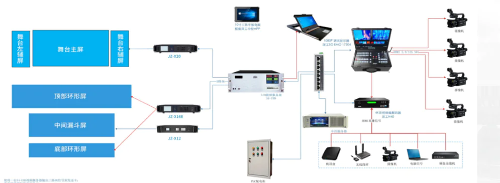 A central control server manages all screen power, stage lights, and connected devices over the network. You can even use a tablet to access this server. It is great for making quick adjustments from anywhere in the venue.